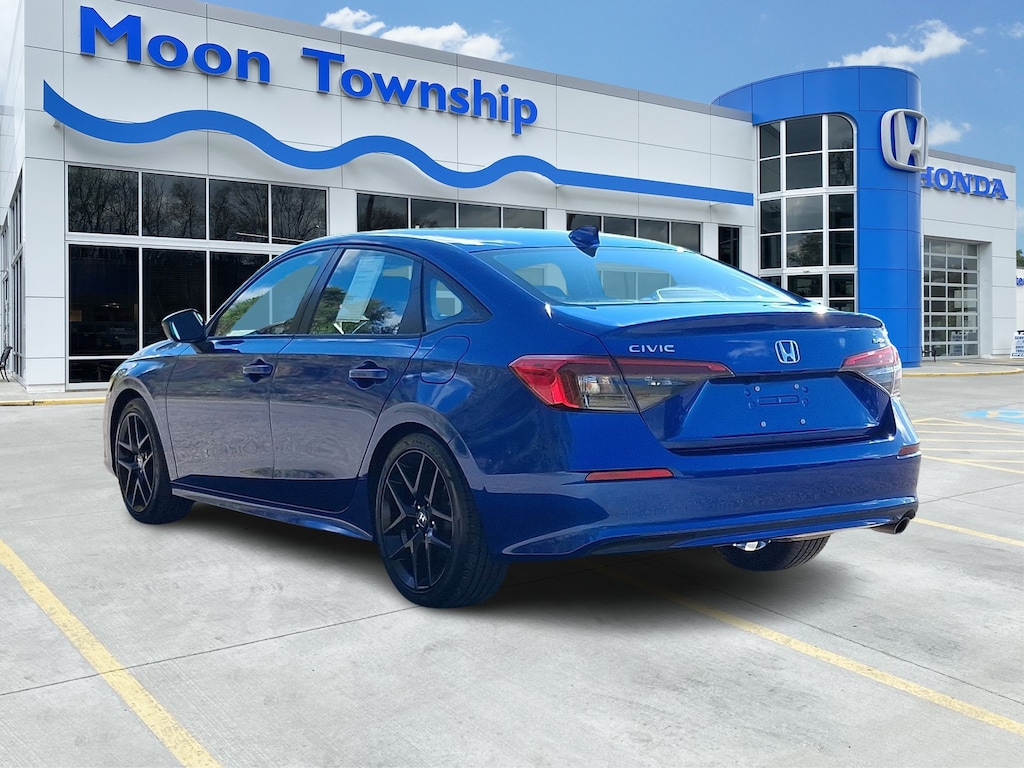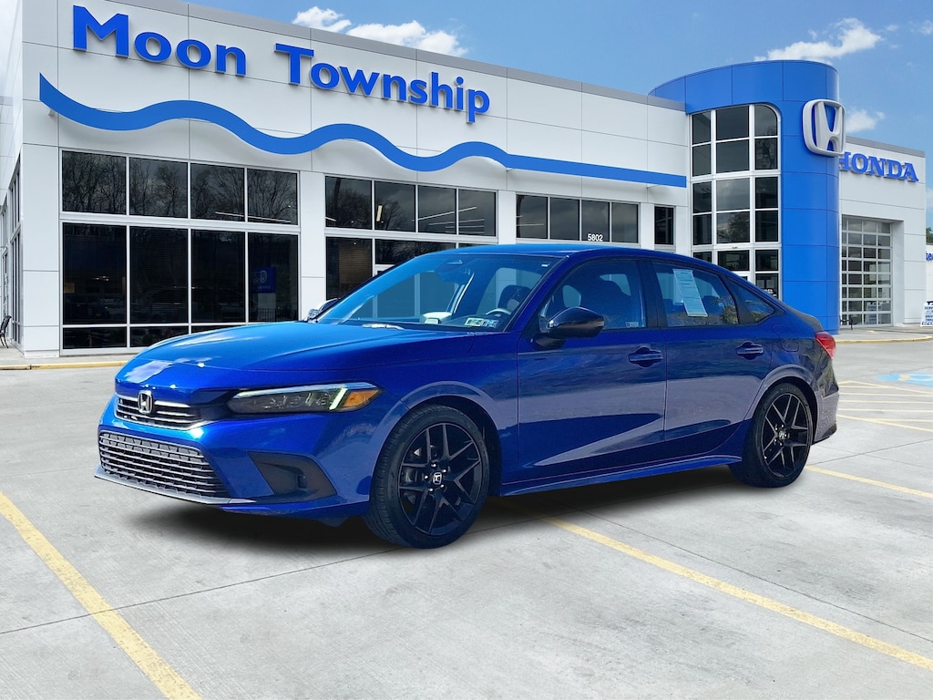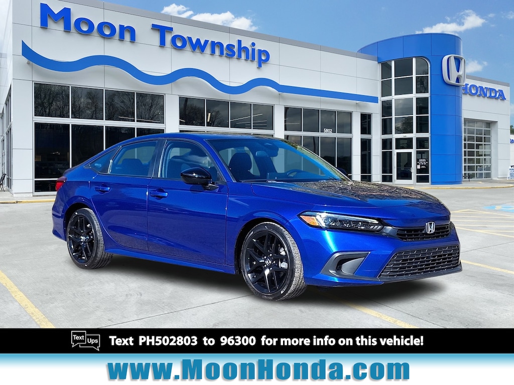 Recent Arrival! 2023 Honda Civic Sport Aegean Blue Metallic BOUGHT, SERVICED AND TRADED AT MOON TOWNSHIP HONDA, RECENT TRADE IN, SERVICE RECORDS AVAILABLE, REMAINDER OF FACTORY WARRANTY, INCLUDES WARRANTY, FUEL SAVER, ONE OWNER, Black w/Cloth Seat Trim, 4-Wheel Disc Brakes, 8 Speakers, ABS brakes, Adaptive Cruise Control: Adaptive Cruise Control (ACC) with Low-Speed Follow, Alloy wheels, AM/FM radio, Apple CarPlay/Android Auto, Auto High-beam Headlights, Automatic temperature control, Brake assist, Bumpers: body-color, Delay-off headlights, Dual front impact airbags, Dual front side impact airbags, Electronic Stability Control, Emergency communication system: HondaLink, Exterior Parking Camera Rear, Four wheel independent suspension, Front anti-roll bar, Fully automatic headlights, Illuminated entry, Knee airbag, Leather Shift Knob, Leather steering wheel, Low tire pressure warning, Occupant sensing airbag, Outside temperature display, Overhead airbag, Panic alarm, Power door mirrors, Radio data system, Radio: 180-Watt Audio System w/8 Speakers, Rear anti-roll bar, Rear side impact airbag, Remote keyless entry, Security system, Speed-sensing steering, Steering wheel mounted audio controls, Tachometer, Telescoping steering wheel, Tilt steering wheel, Traction control, Wheels: 18" Gloss Black Alloy. CARFAX One-Owner. 30/37 City/Highway MPG Priced below KBB Fair Purchase Price!